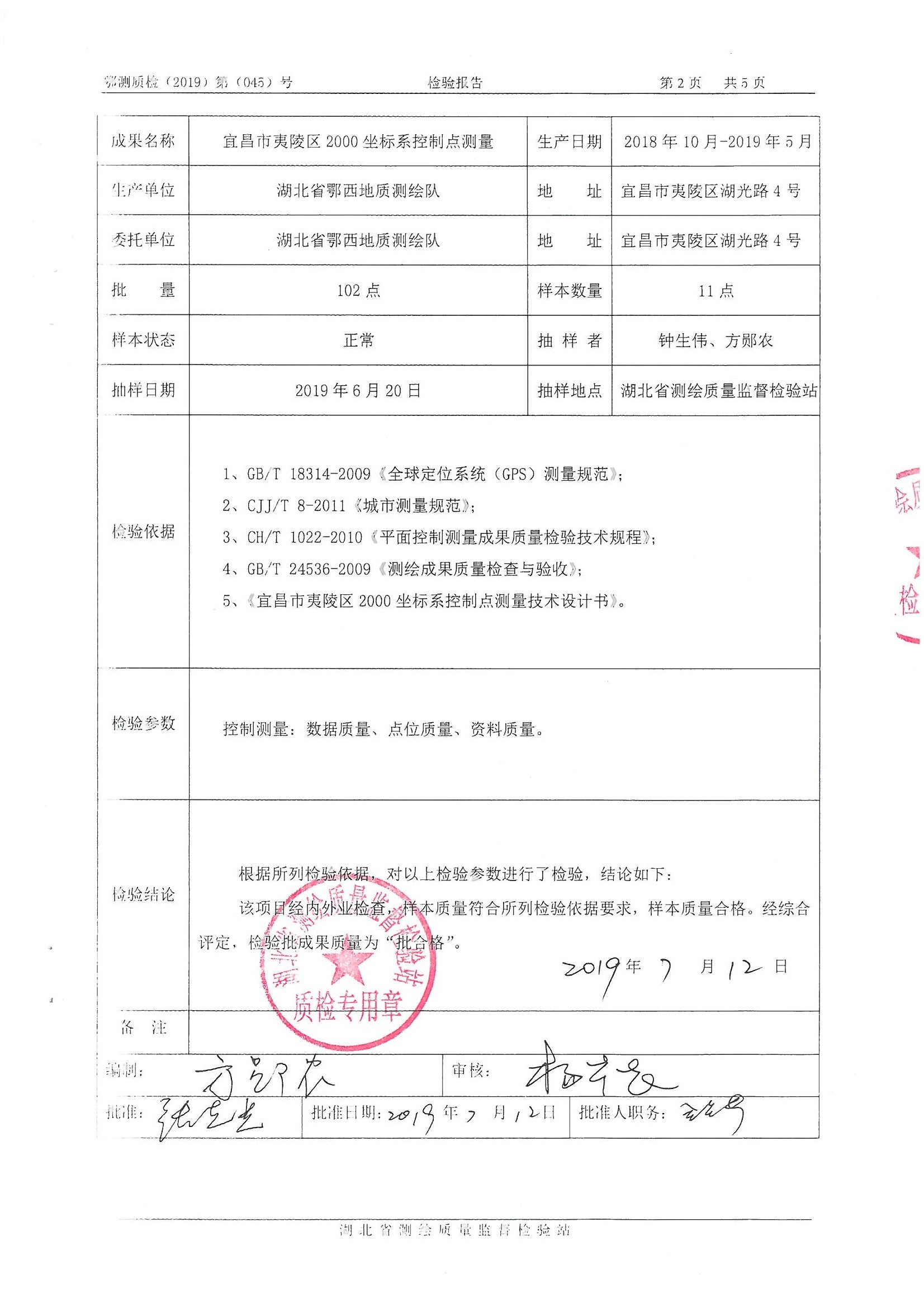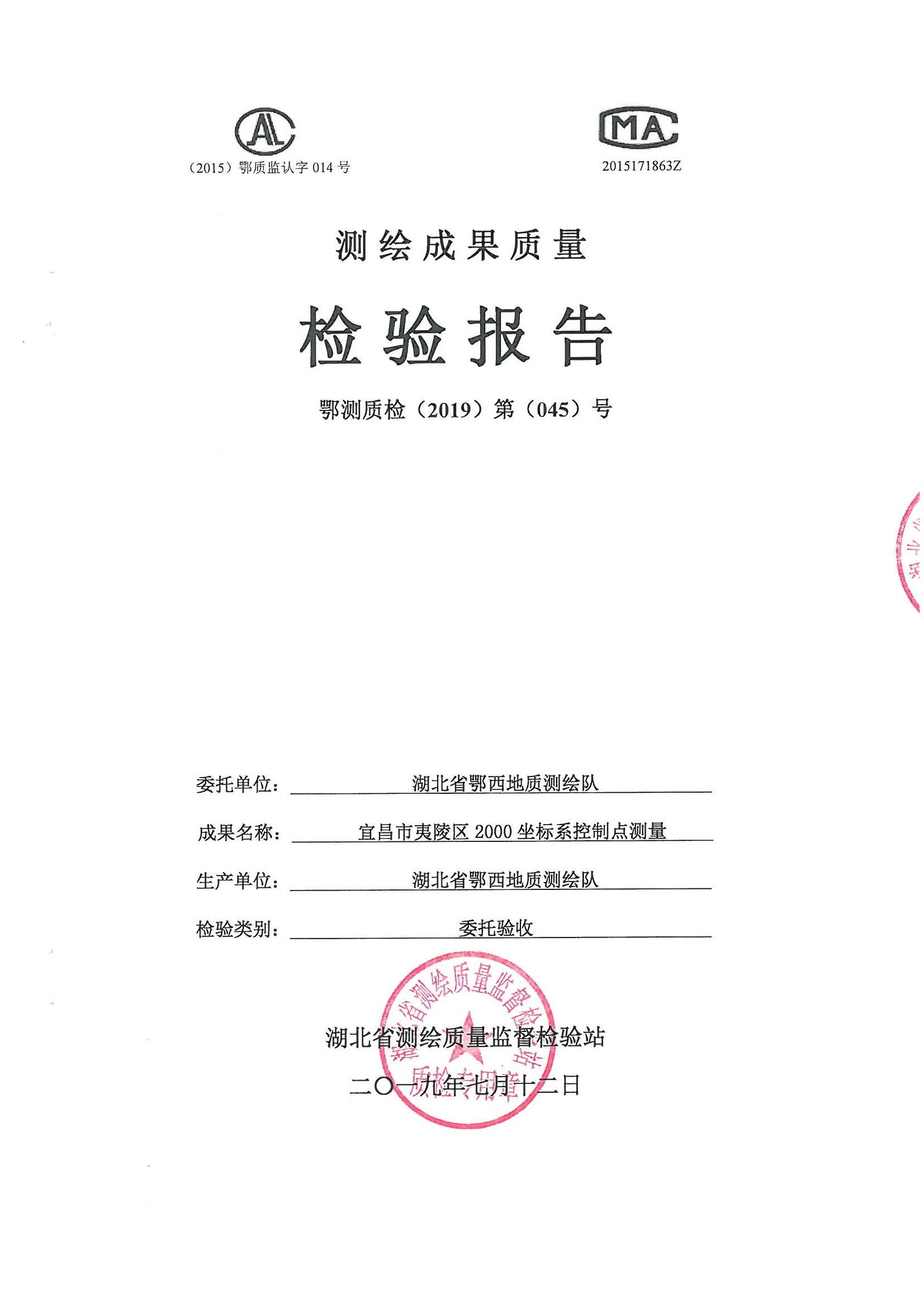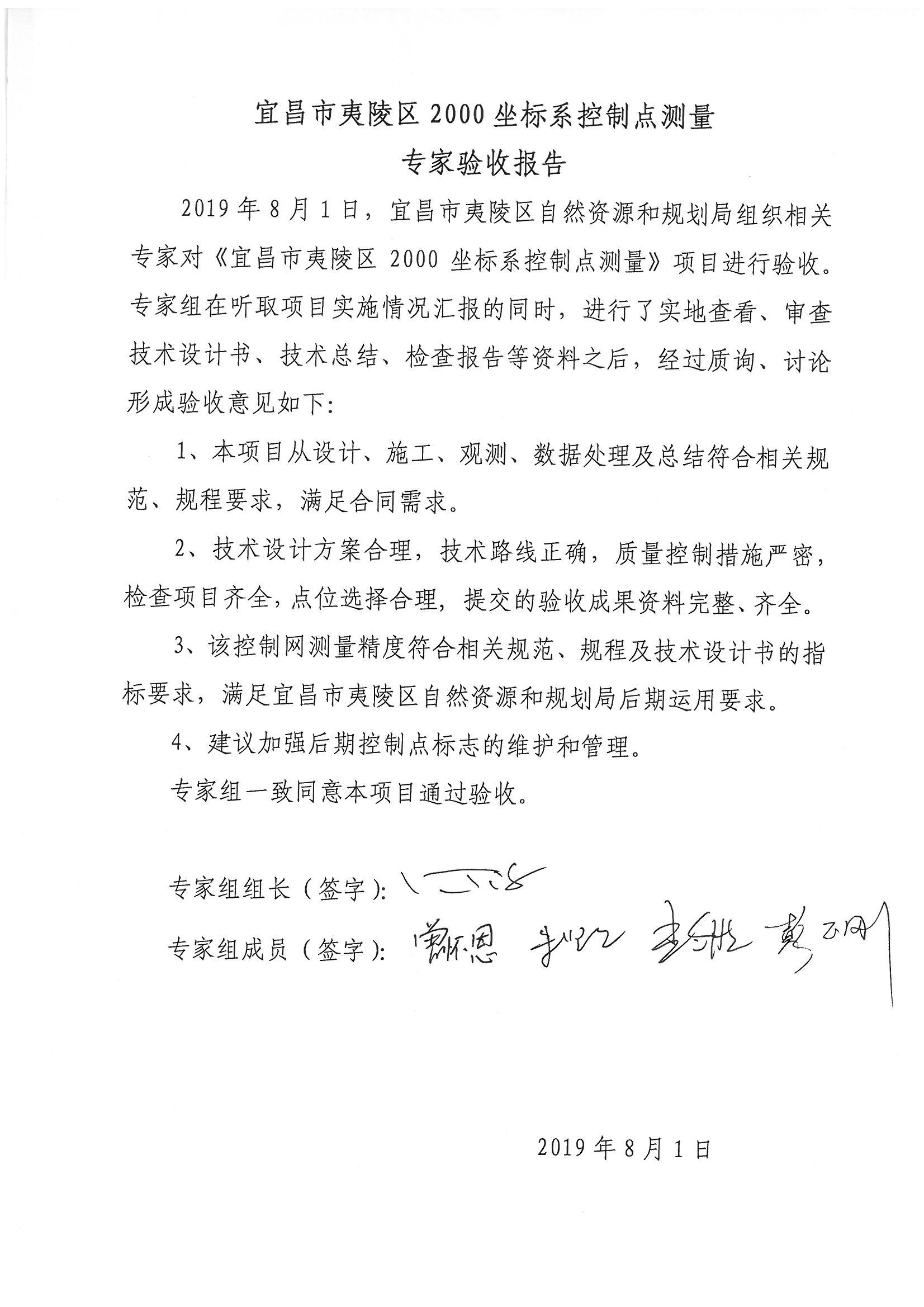 宜昌市(shì)夷陵區(qū)2000坐(zuò)标系控制(zhì)點測量項目于2018年(nián)10月(yuè)8日(rì)開(kāiΩ)工(gōng),2019年(nián)5月(yuè)31日(rì)竣工(gōng)。2019年(nián)7月(yuè)12日(rì)通(tōng)過湖(hú)北(běi)省©測繪質量監督檢驗站(zhàn)驗收,見(jiàn)圖1、圖2;8月(yuè)2日(rì)通(tōng)過夷陵區(qū)φ自(zì)然資源和(hé)規劃局驗收,驗收成果等級為(wèi)合格,見(jiàn)圖3、圖4